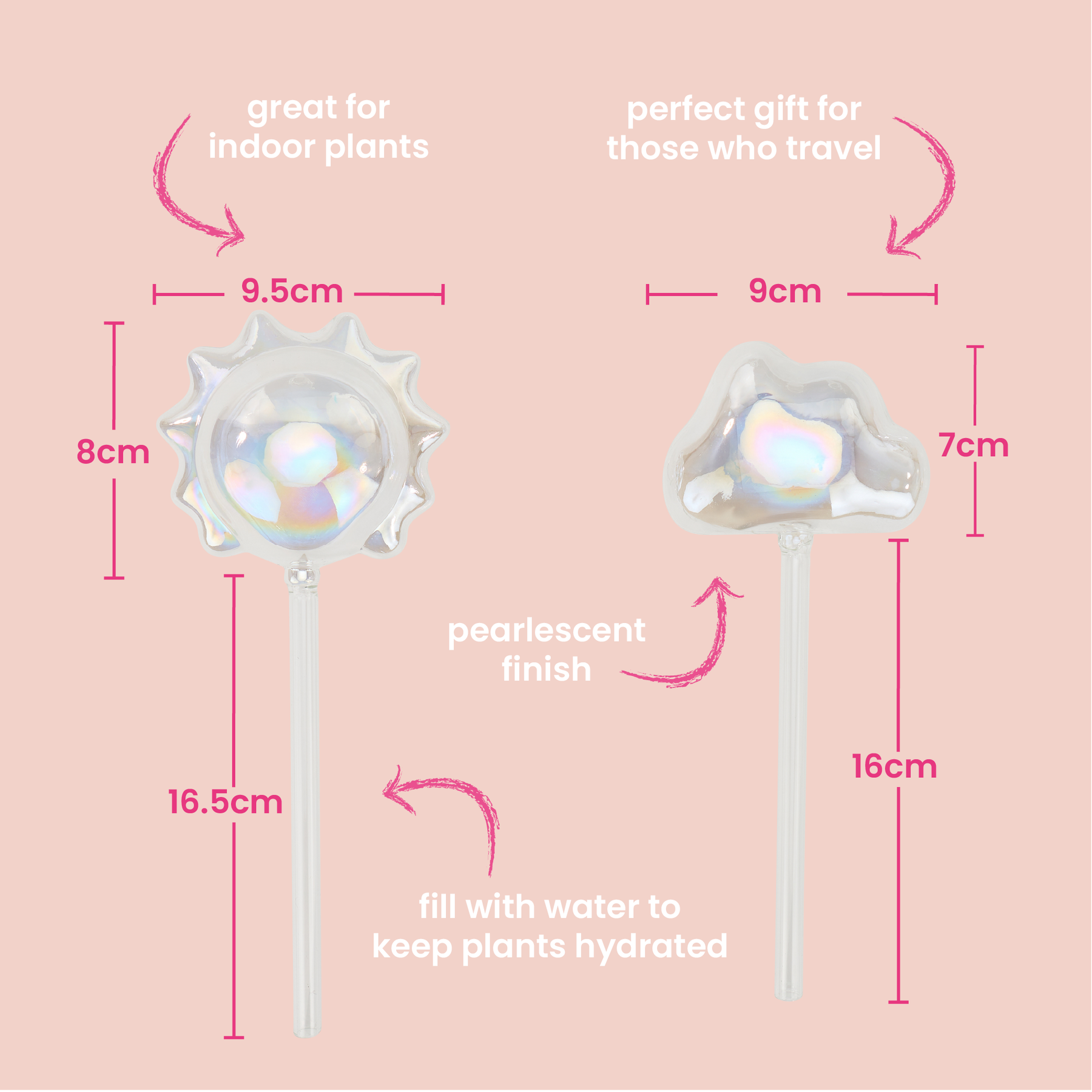 Keep your indoor plants consistently hydrated with the Sun and Cloud glass Plant Water Globes, available as a set of two. Fill each globe with water and place it directly into the soil to ensure a continuous, controlled water supply. This method supports plant health by maintaining optimal moisture levels, especially useful during vacations or hectic schedules. These water globes reduce the need for frequent watering, promoting robust growth. An excellent and practical gift for enthusiasts dedicated to dependable plant care. Box Size: 26cm x 12cm x 7cm. Size: Sun 25cm x 7cm, Cloud - 23cm x 10.5cm,